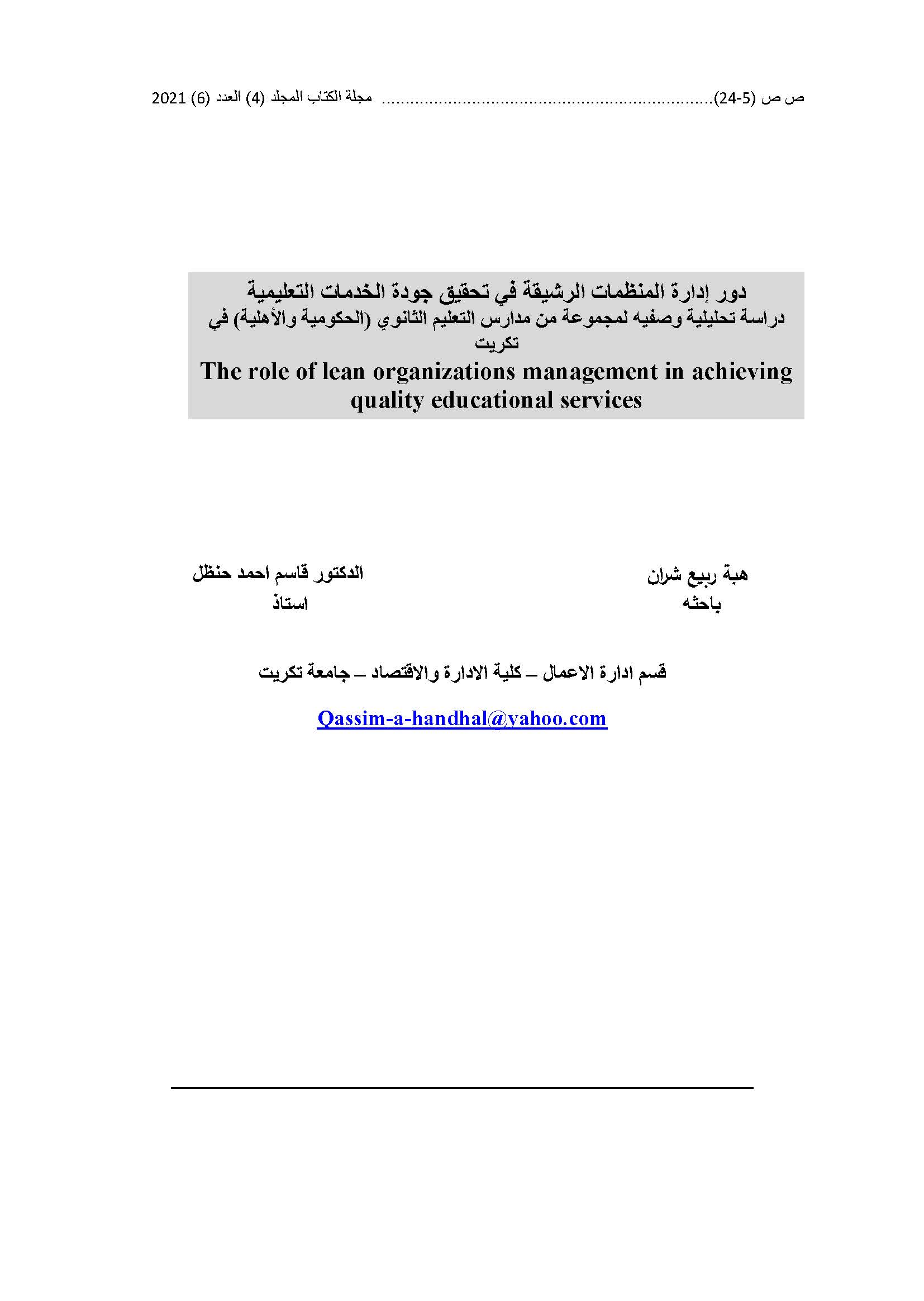 The role of lean organizations management in achieving quality educational servicesAbstract views : 81 | PDF downloads : 65Page No.: 5-24 |
