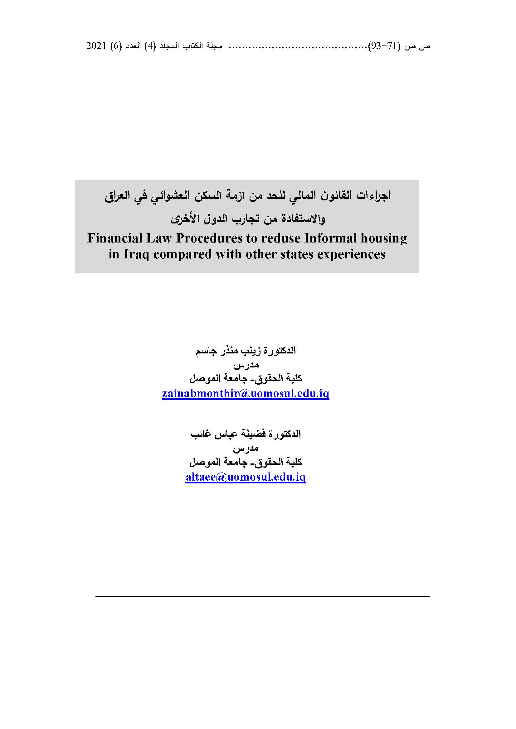 Financial Law Procedures to reduse Informal housing in Iraq compared with other states experiencesAbstract views : 62 | PDF downloads : 73Page No.: 71-93 |