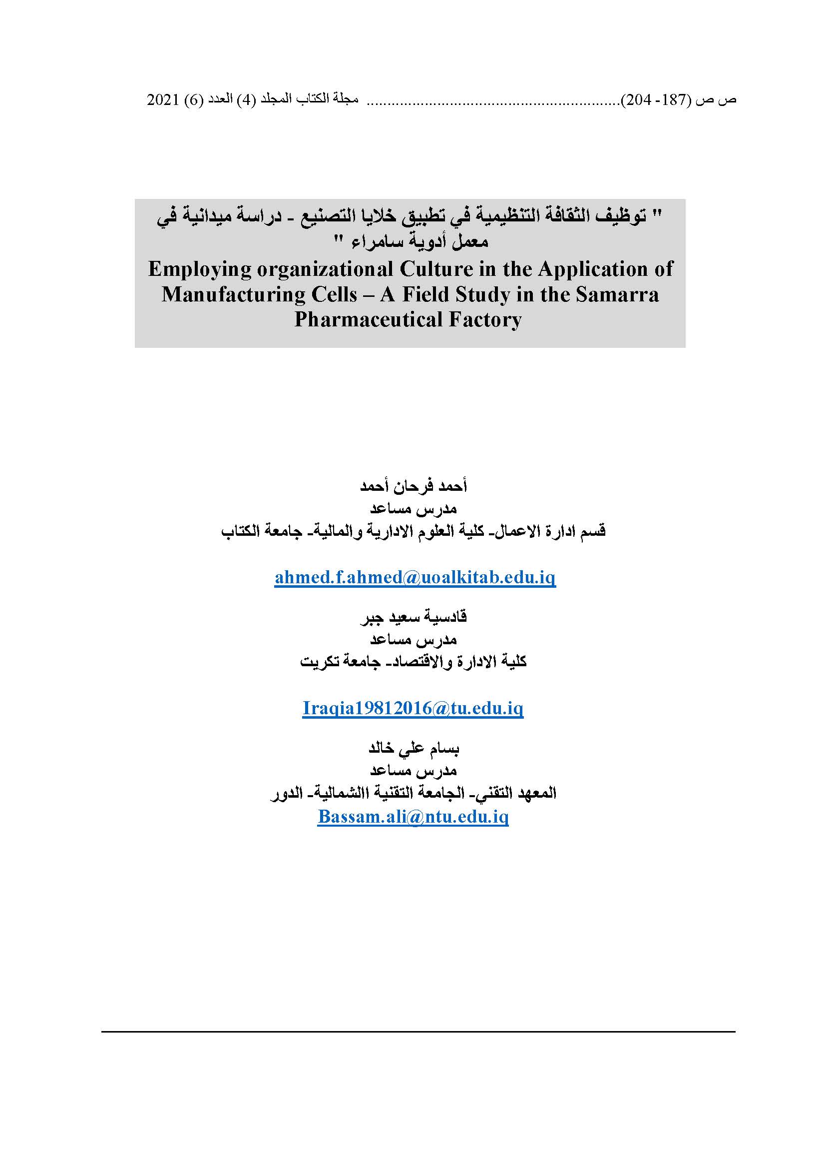 Employing organizational Culture in the Application of Manufacturing Cells – A Field Study in the Samarra Pharmaceutical FactoryAbstract views : 92 | PDF downloads : 51Page No.: 187-204 |