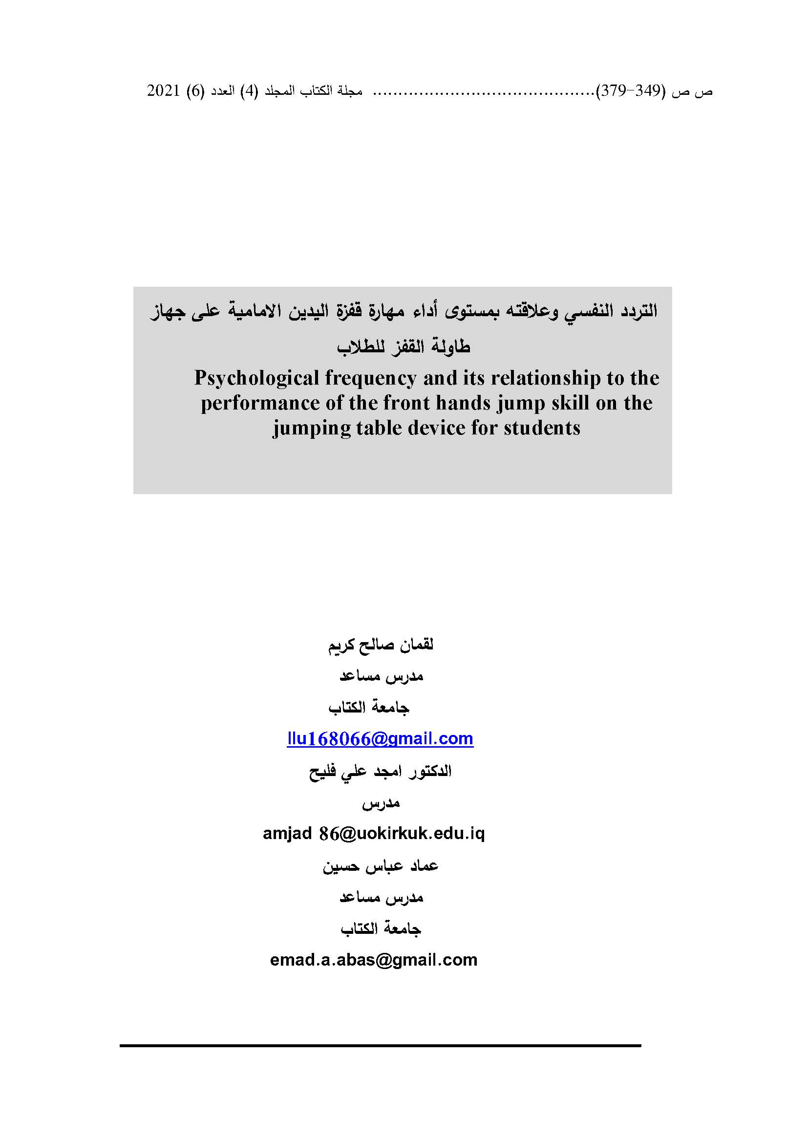 Psychological frequency and its relationship to the performance of the front hands jump skill on the jumping table device for studentsAbstract views : 61 | PDF downloads : 57Page No.: 349-379 |