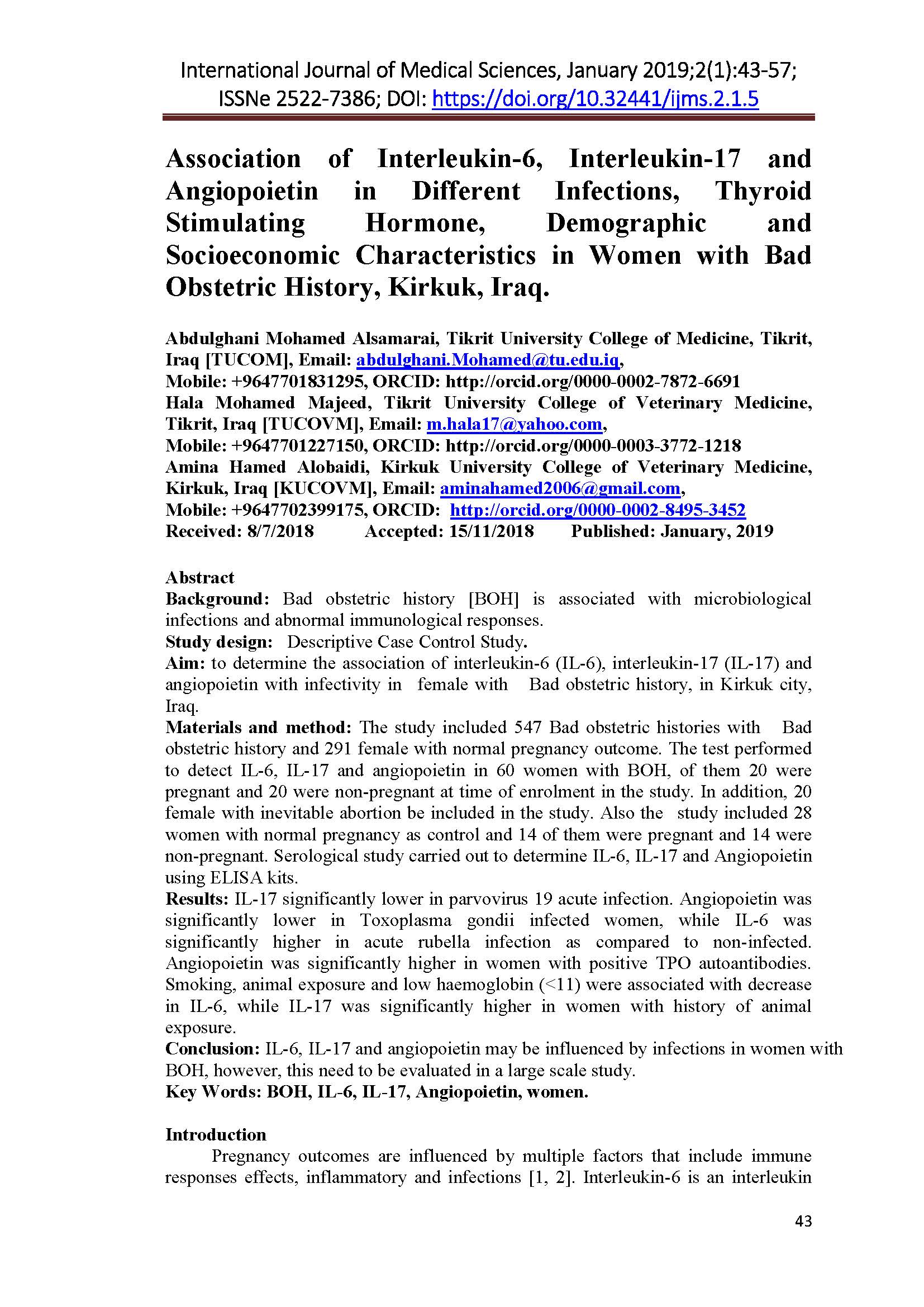 Association of Interleukin-6, Interleukin-17 and Angiopoietin in Different Infections, Thyroid Stimulating Hormone, Demographic and Socioeconomic Characteristics in Women with Bad Obstetric History, Kirkuk, Iraq.