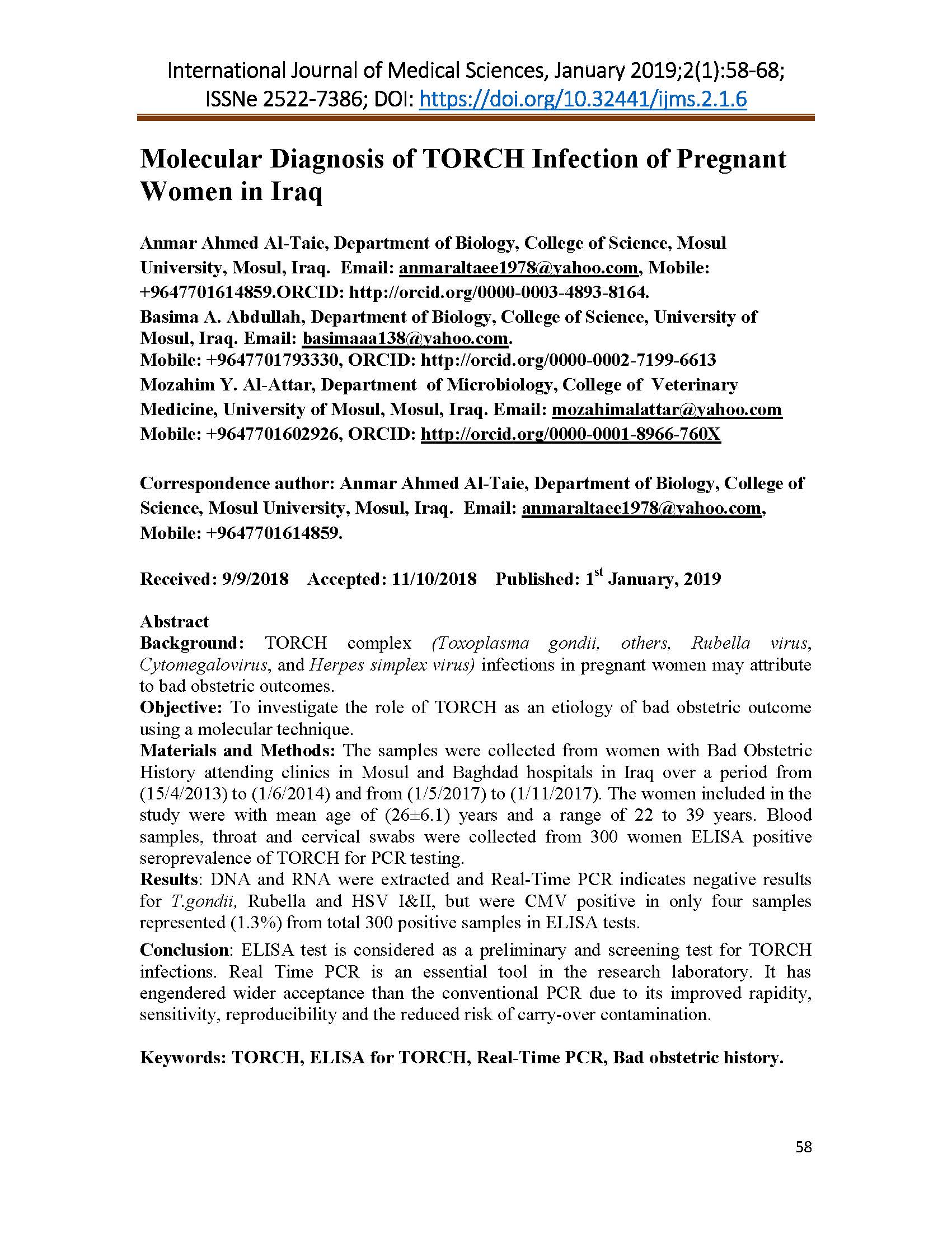 Molecular Diagnosis of TORCH Infection of Pregnant Women in Iraq