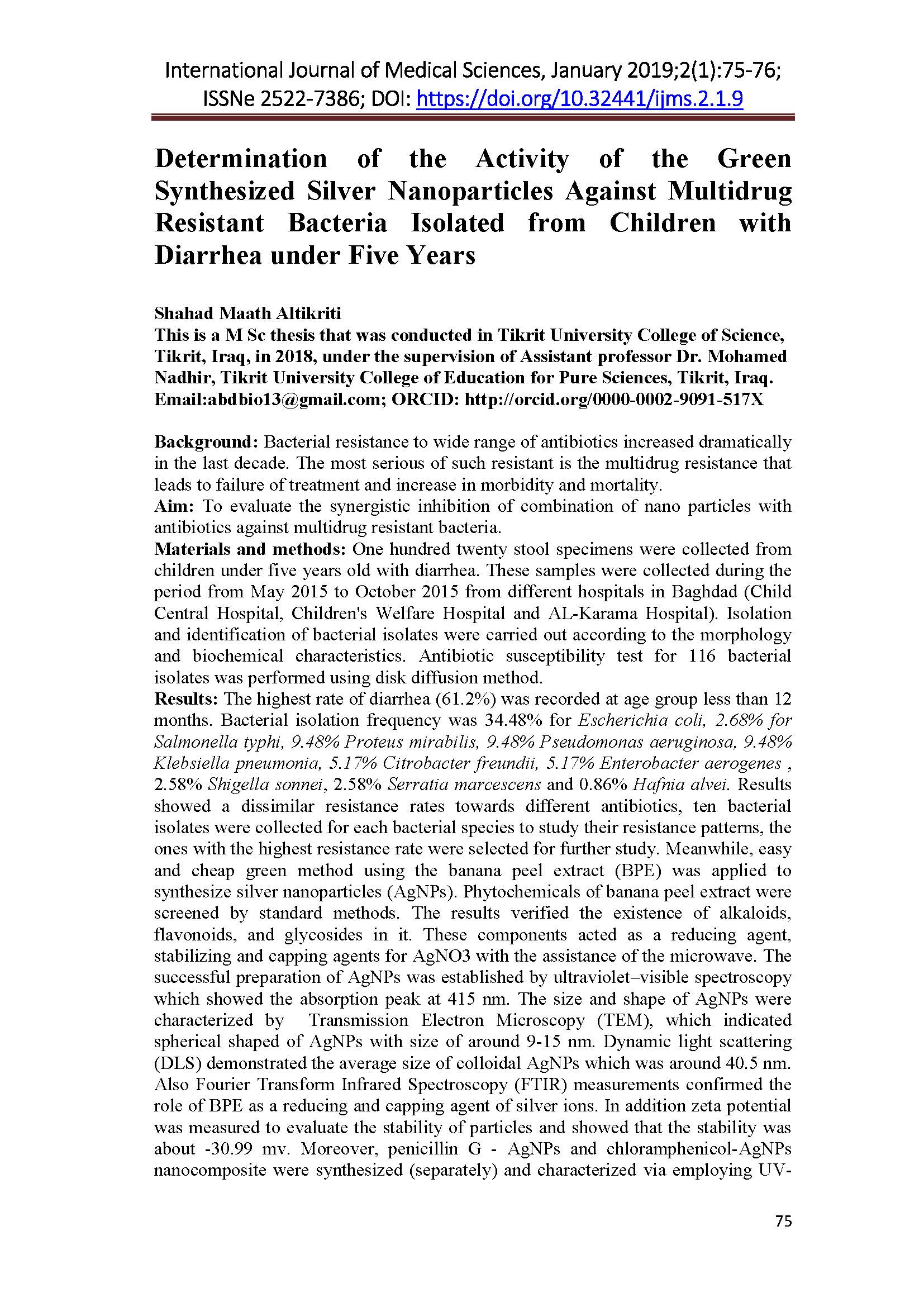 Determination of the Activity of the Green Synthesized Silver Nanoparticles Against Multidrug Resistant Bacteria Isolated from Children with Diarrhea under Five Years