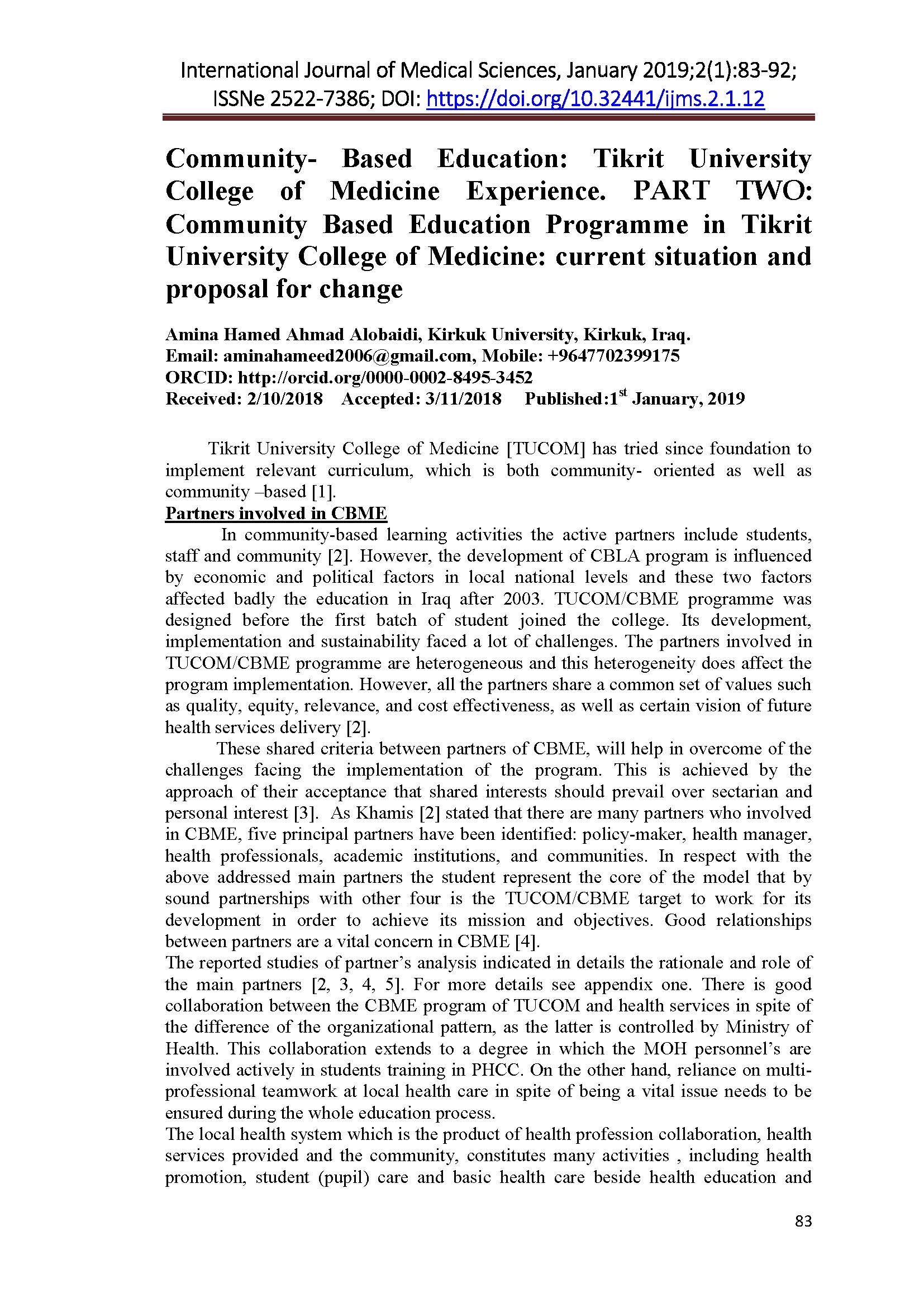 Community- Based Education: Tikrit University College of Medicine Experience. PART TWO: Community Based Education Programme in Tikrit University College of Medicine: current situation and proposal for change